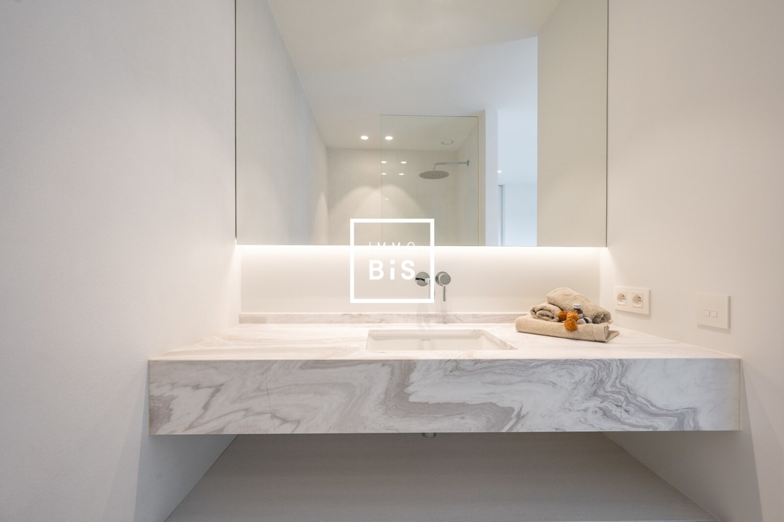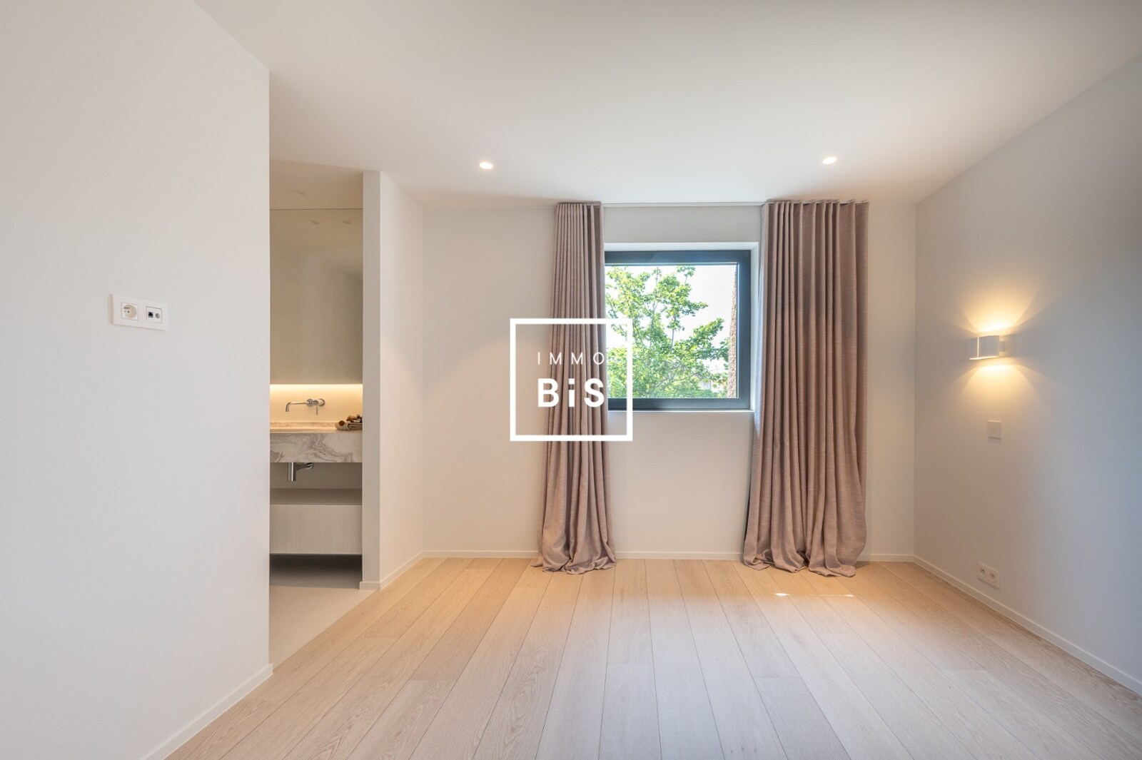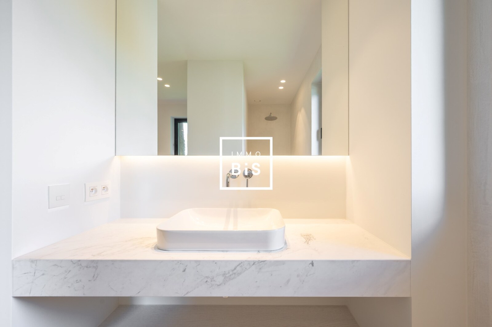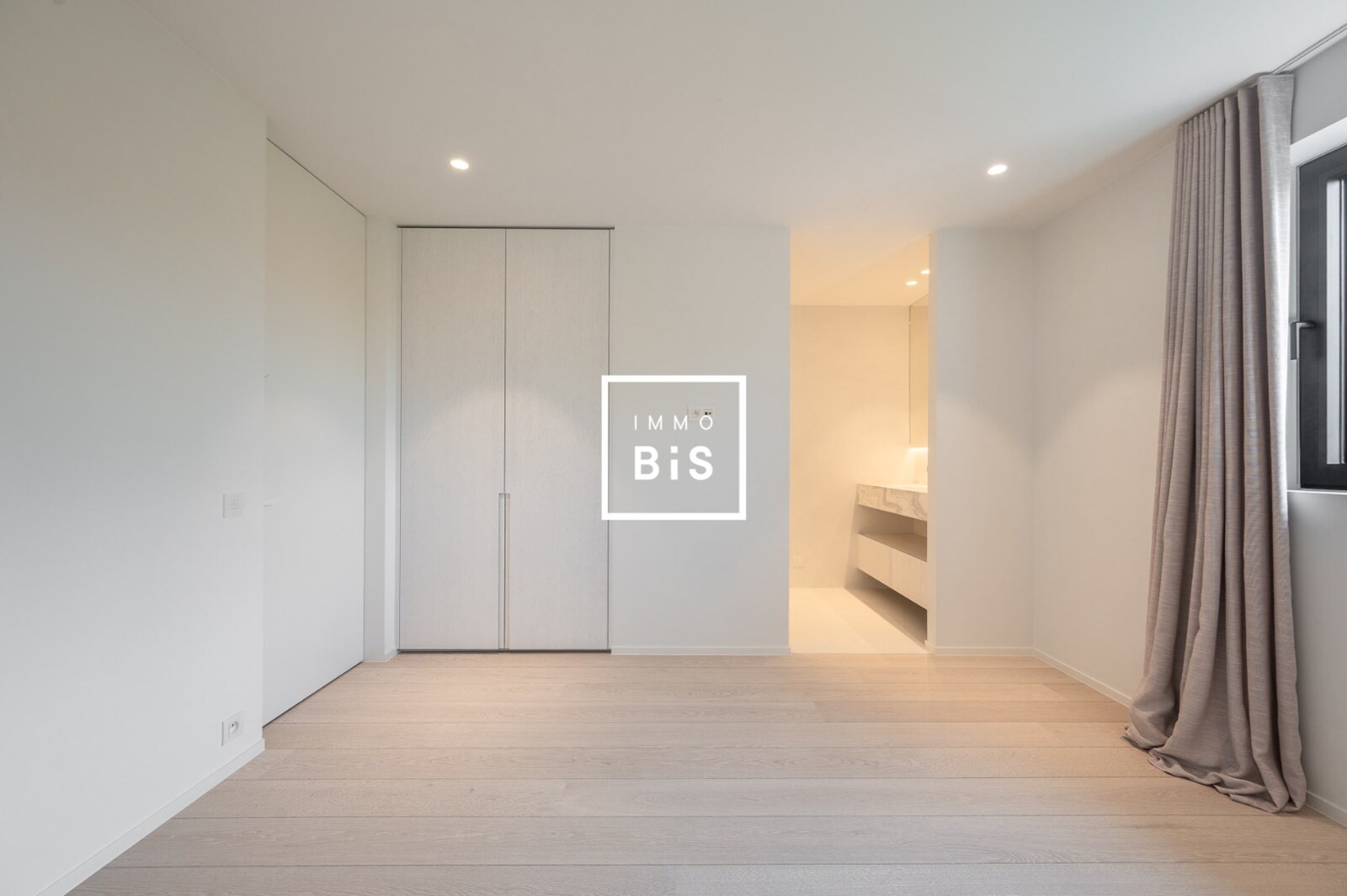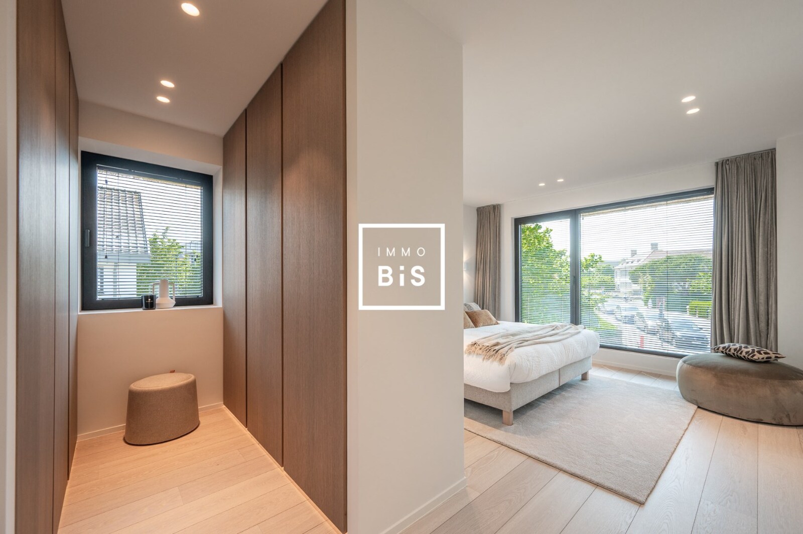 Eerste verdieping: Royale master bedroom met dressing en luxueuze badkamer (ligbad, inloopdouche, toilet). Twee bijkomende slaapkamers, elk met een eigen douchekamer.