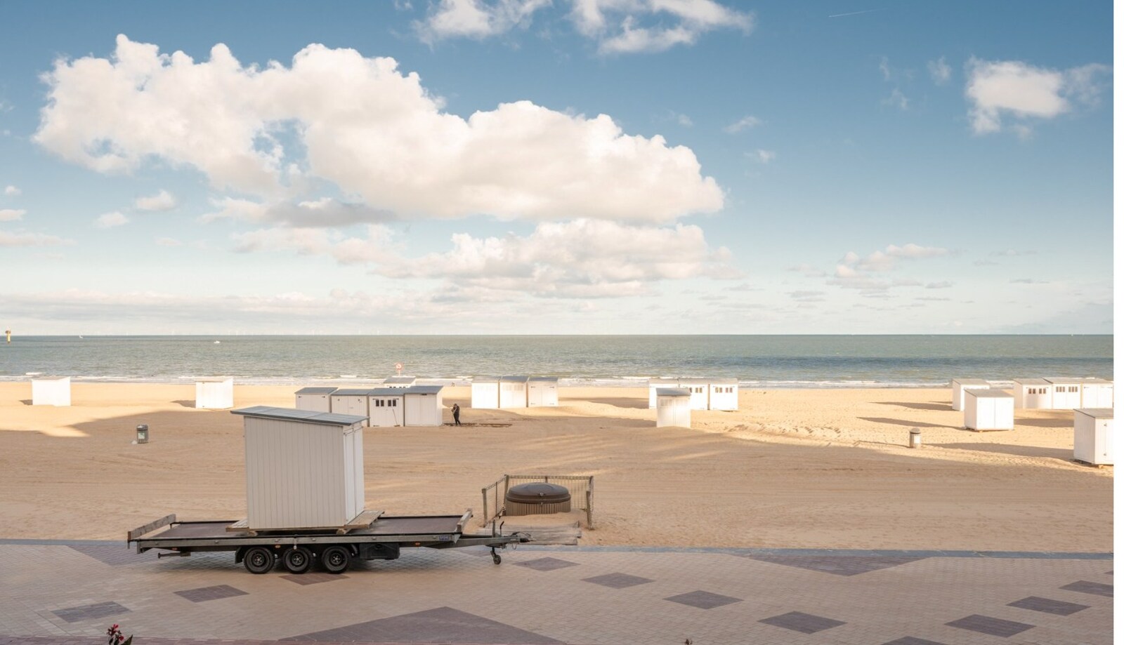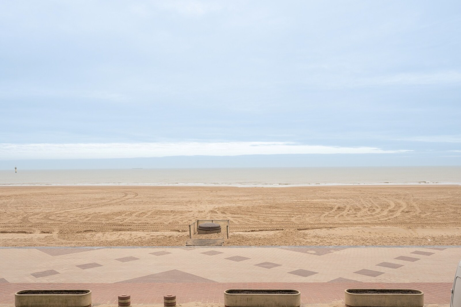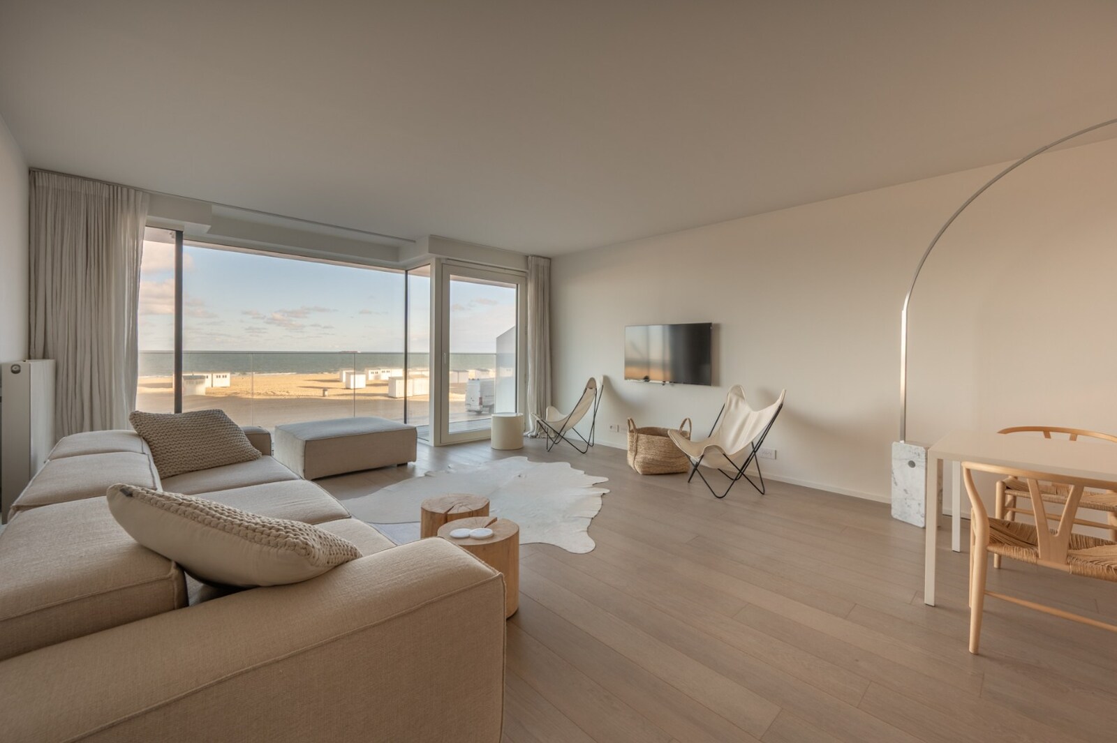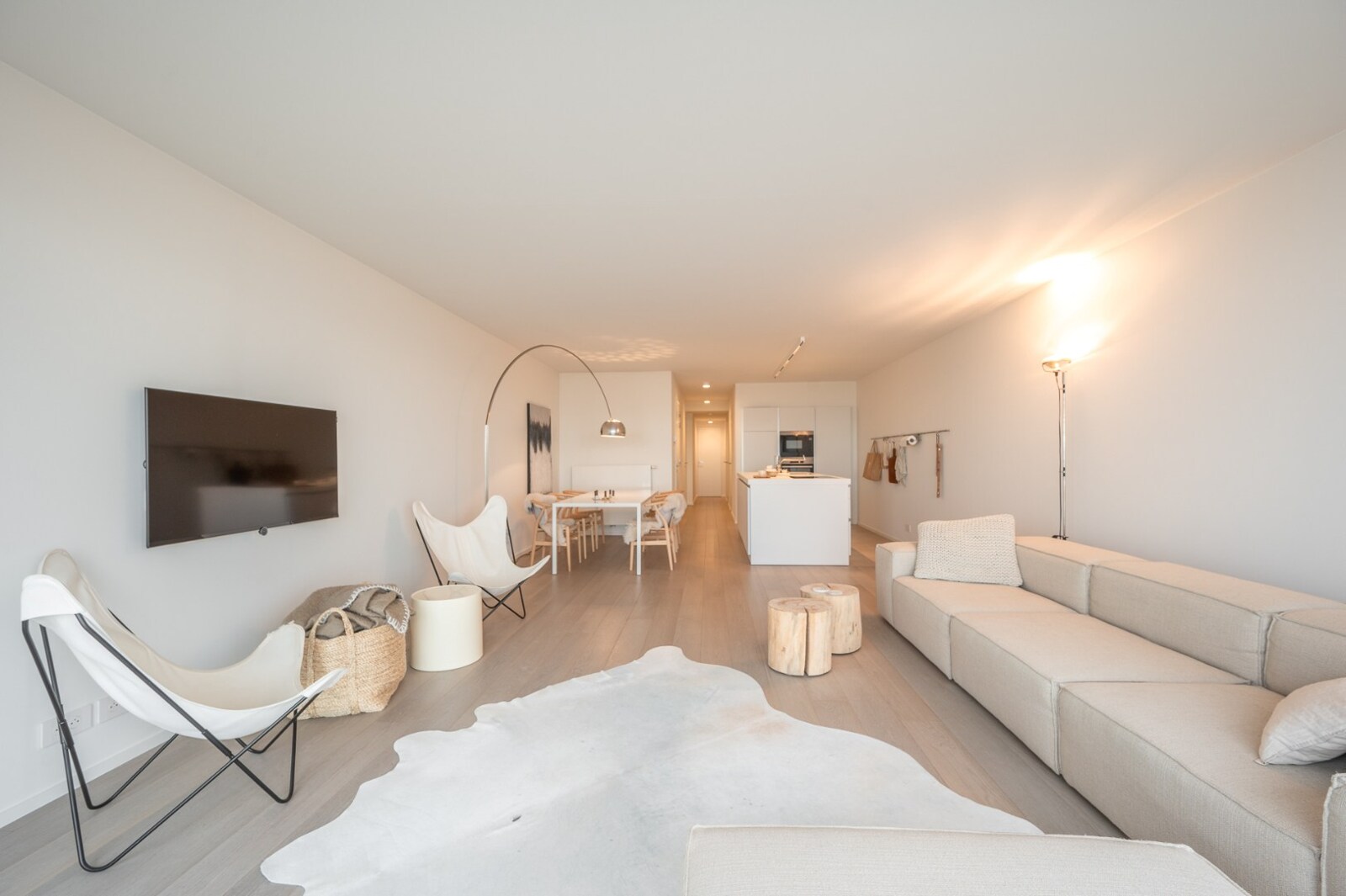 Inkomhal met vestiaire en toilet. Ruime woonkamer met prachtig frontaal zeezicht en toegang tot het terras. Volledig ingerichte open keuken.