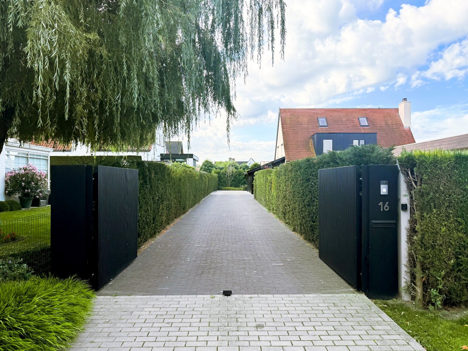 Via de afgesloten oprijlaan met elektrische poort bereikt u de woning, waar meerdere parkeerplaatsen voorzien zijn. De inkomhal verwelkomt u met een gastentoilet en vestiaire en leidt naar de elegante, lichtrijke leefruimte met sfeervolle gashaard. Aansluitend bevindt zich de luxueuze open keuken, afgewerkt met hoogwaardige materialen en uitgerust voor optimaal kookcomfort. Verder beschikt de woning over een praktische bijkeuken en wasruimte, evenals een ruime fietsenberging.
